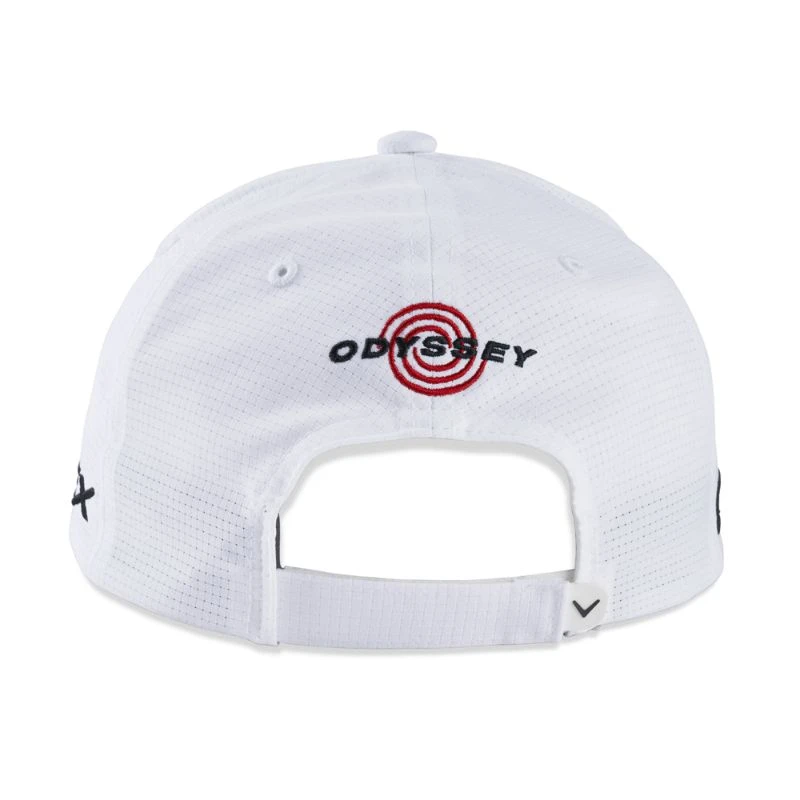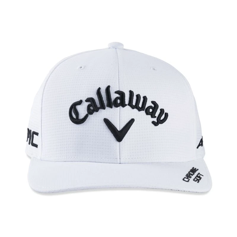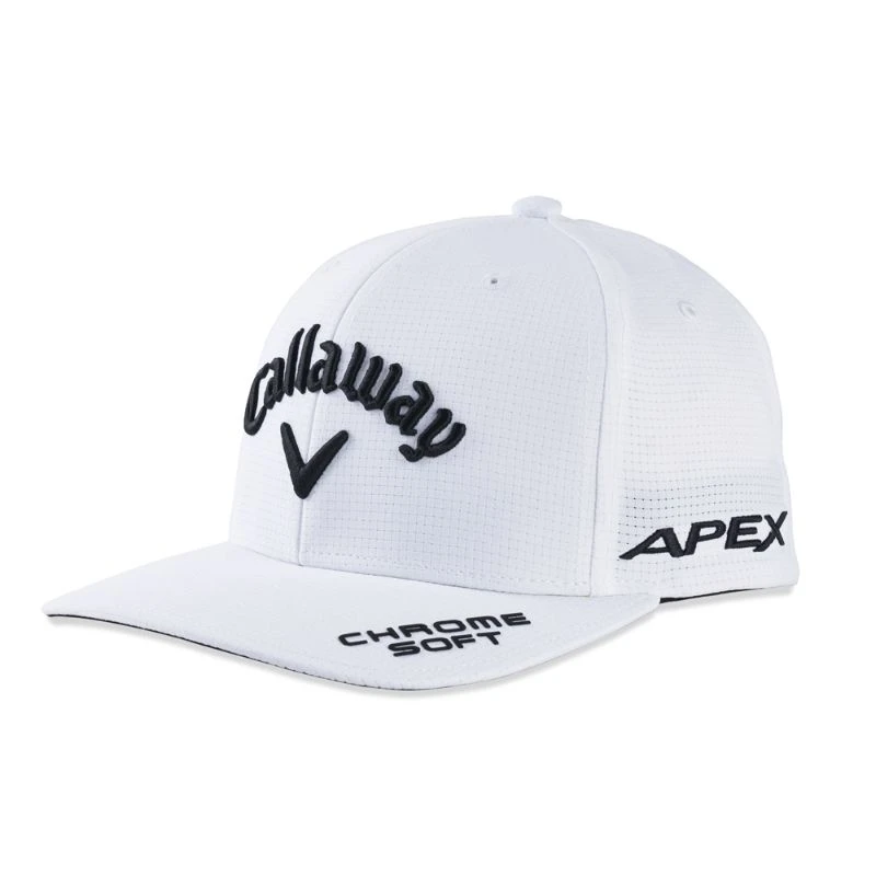 The Official 2022 Tour performance golf cap as worn on tour by Callaway Staff Players. Featuring embroidered Callaway Rogue ST, Apex, Chrome Soft & Odyssey putter tour logos.