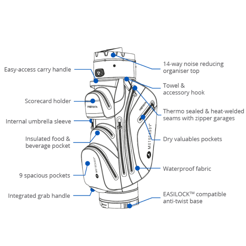 The PROTEKTA is also EASILOCKâ„¢ compatible, securely attaching to any Motocaddy trolley without the need for a lower bag support strap. The anti-twist bag base is compatible with a wide range of trolleys, ensuring that this bag can be used with ease on any course.