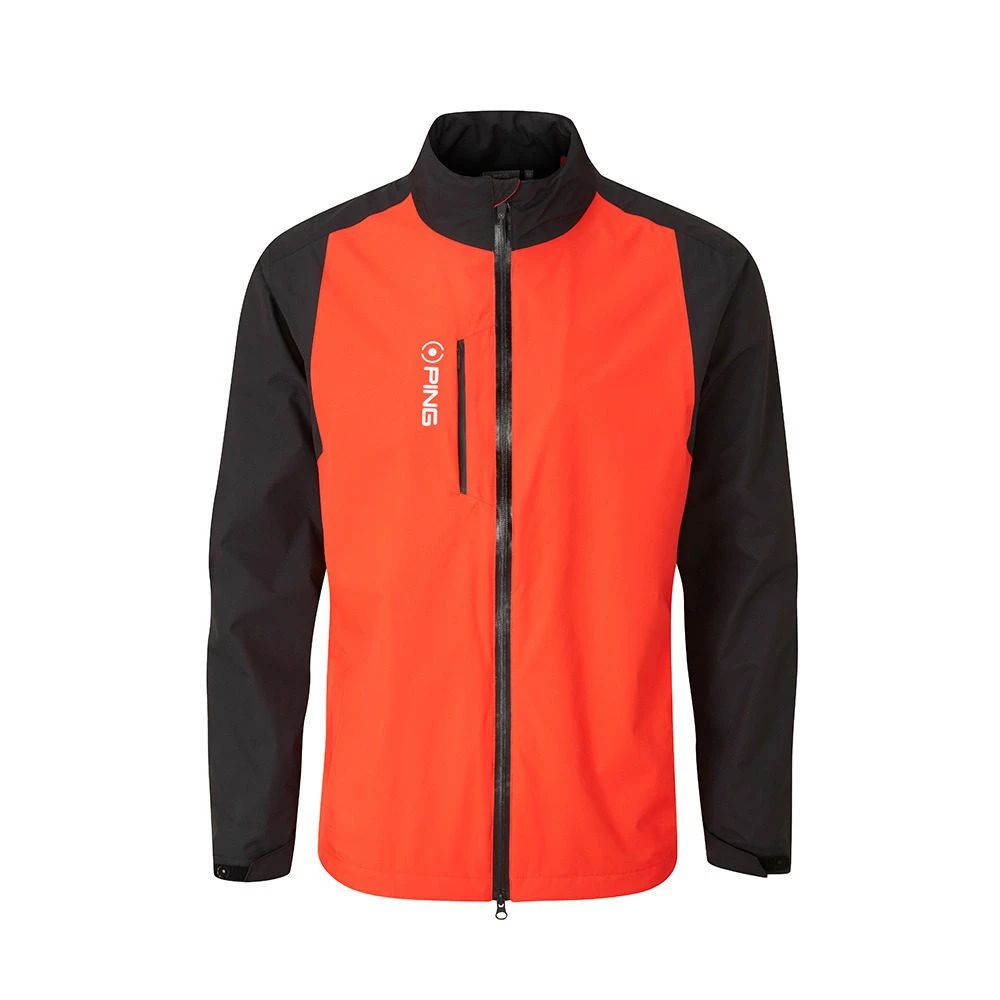 Waterproof PING golf jacket engineered for waterproof protection in wet weather incorporating additional features for added comfort.